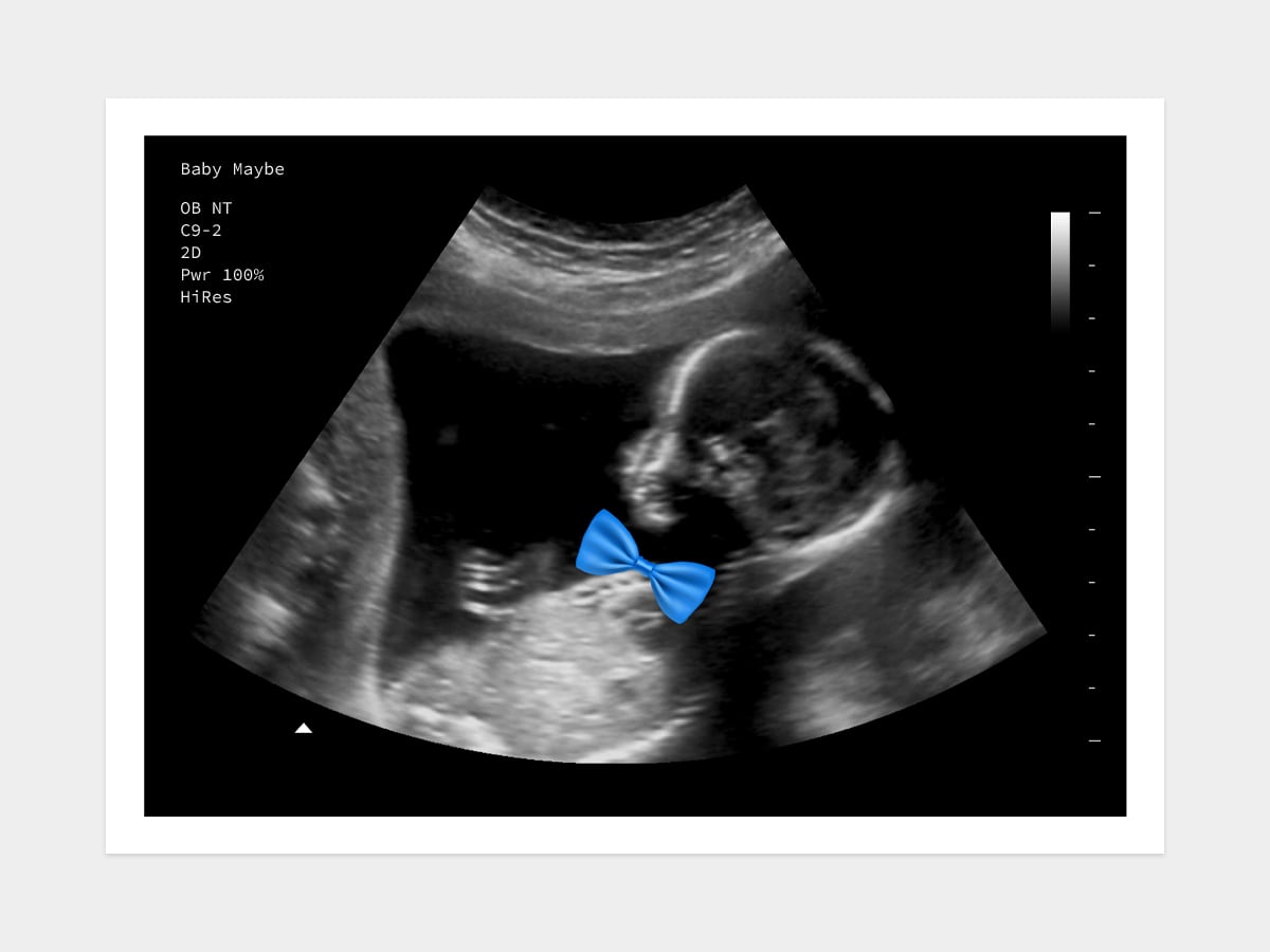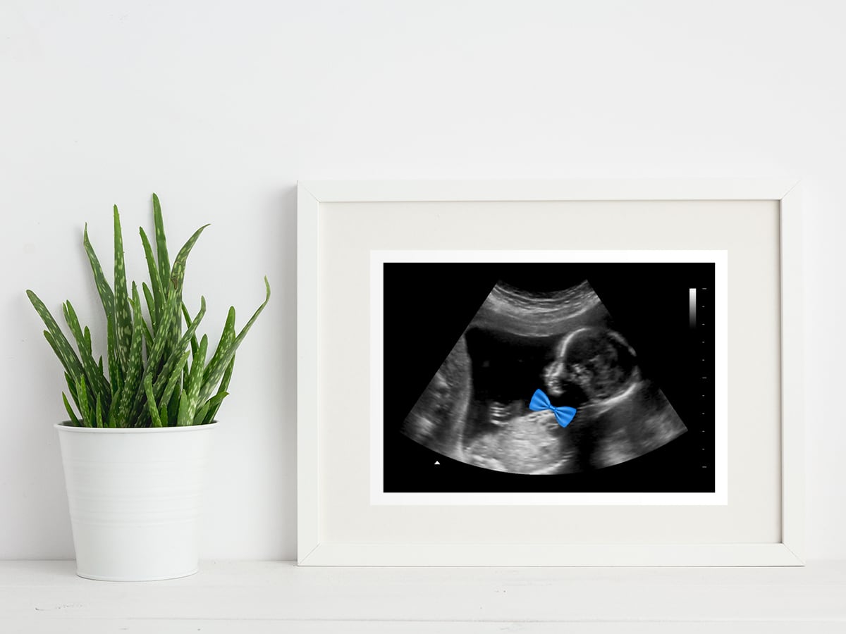 A fun design featuring a baby wearing a cute blue bowtie! This handsome gender reveal fake ultrasound scan is perfect for gender reveal parties, or simply to dress up your prank with a cute blue accessory.