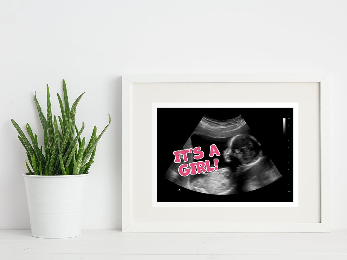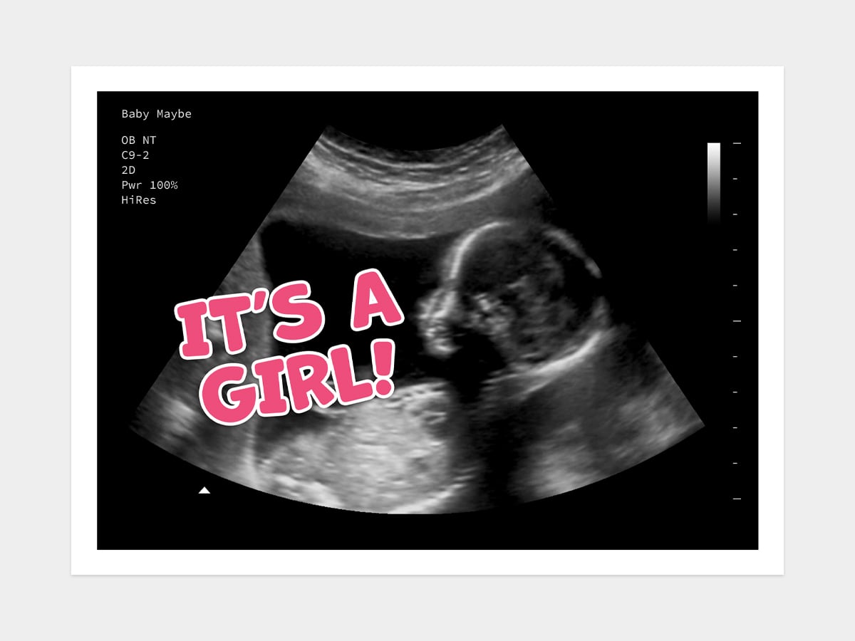 A fun design featuring a baby overlaid with the words "It's a Girl!" This feminine gender reveal fake ultrasound scan is perfect for gender reveal parties, or simply to fancy up your prank with a pop of pink color.